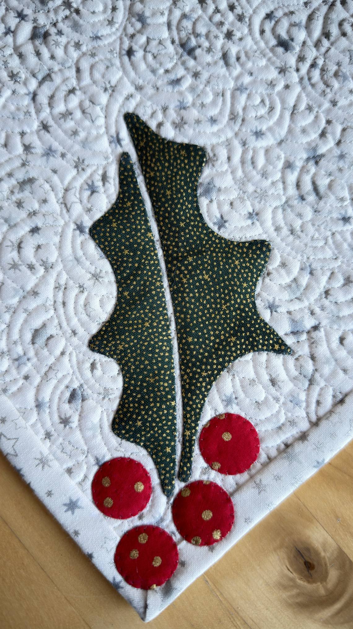 And we keep going! Quilters, now it’s time for the Christmas holly. You need to make four leaves and fourteen red circles. Next week we will finish it.